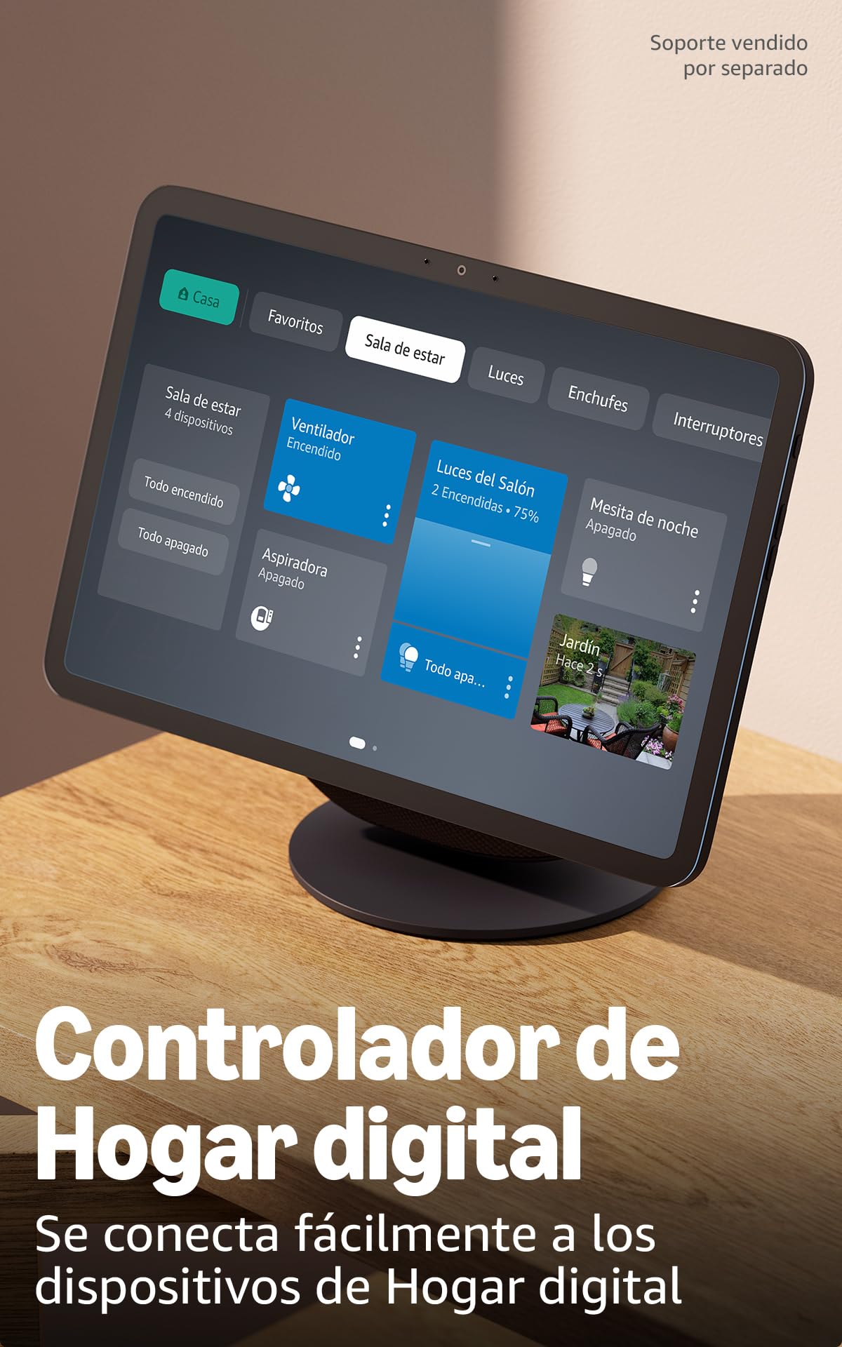 - Controla tu Hogar digital fácilmente. Vincula y controla miles de dispositivos compatibles con Alexa sin necesidad de un controlador de Hogar digital adicional. Echa un vistazo a las imágenes de tus cámaras. Controla luces, termostatos y más desde la pantalla táctil o a través del control por voz. Con la tecnología Omnisense, puedes activar rutinas en función de la temperatura o la detección de presencia.